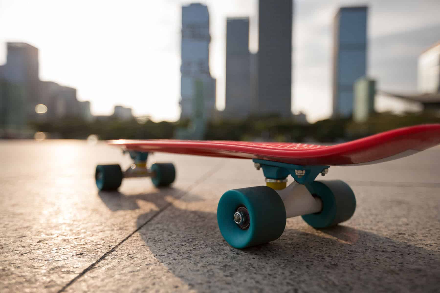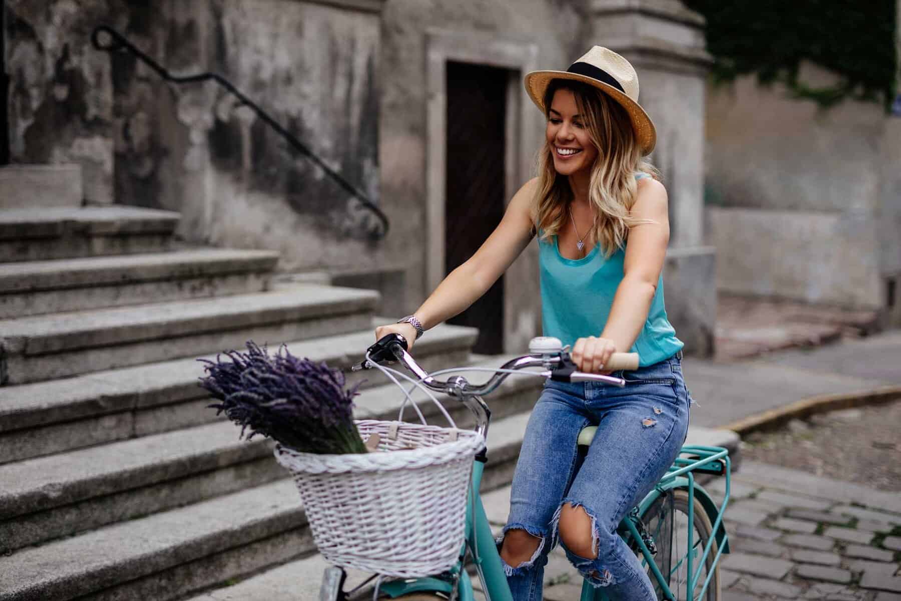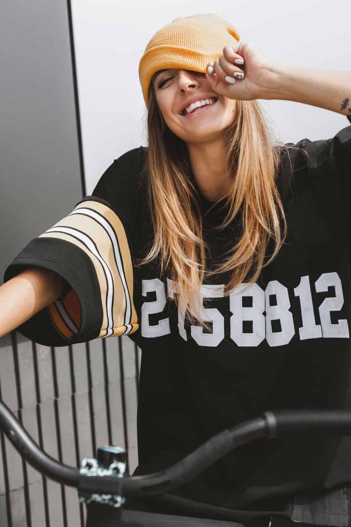 23. Smilende ung kvinde med solbriller, bordeaux rygsæk og stråhat på gaden i solskin.